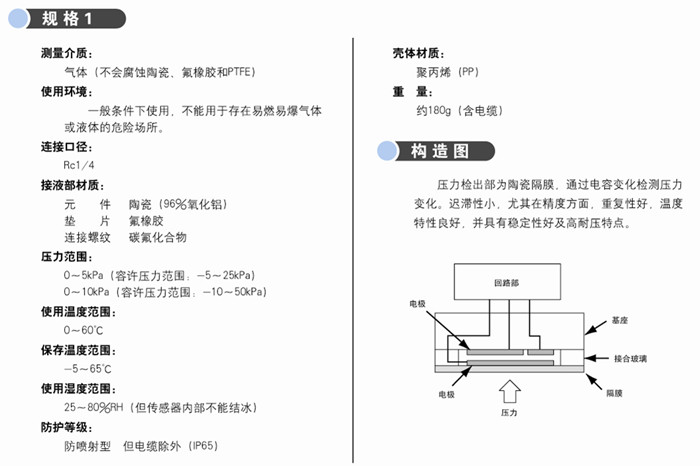 該產品采用了再現性良好的陶瓷隔膜作為感壓元件,引進了新型的碳氟化合物殼體和氣體導入管,使產品的耐腐蝕性進一步提高,能作為凈化設備壓力檢測裝置使用